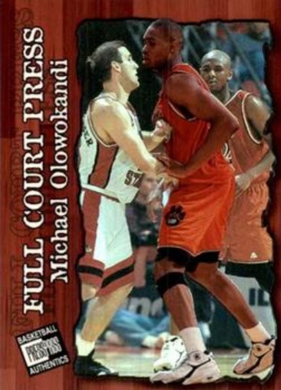 The Michael Olowokandi 1998 Press Pass Authentics #FP10 Full Court Press Rookie card is 1 of 9 Michael Olowokandi's card variations in the 1998 Press Pass Authentics set being tracked by Sports Card Investor, including #45 Base, #1 Base, #45 Hang Time, #1 Hang Time, and #LC1 Lottery Club.