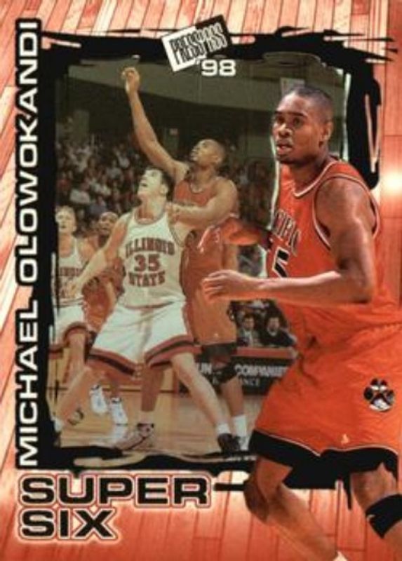 The Michael Olowokandi 1998 Press Pass Flagship #S6 Super Six Rookie card is 1 of 11 Michael Olowokandi's card variations in the 1998 Press Pass Flagship set being tracked by Sports Card Investor, including Base, In The Zone, Red, Reflectors, and Torquers.