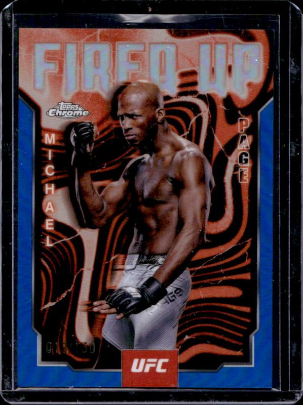 The Michael Page 2025 Topps Chrome UFC #FUP-5 Fired Up - Blue Refractor /150 card is 1 of 85 Michael Page's card variations in the 2025 Topps Chrome UFC set being tracked by Sports Card Investor, including Base, Geometric Refractor, Negative Refractor, Prism Refractor, and Purple Refractor.