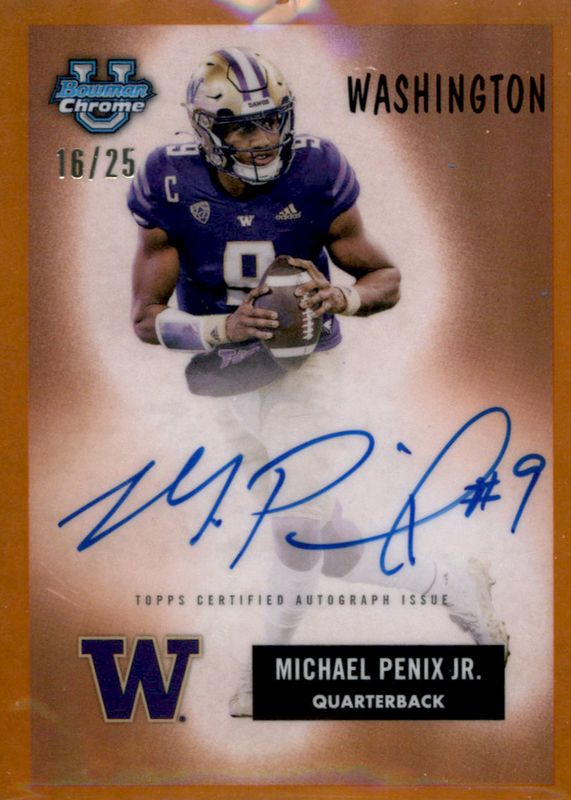 Auctions Ending Soon for Michael Penix Jr. 2023 Bowman Chrome University #55B-MP 1955 Bowman Football Autographs - Orange Refractor /25 RAW