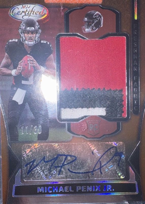 The Michael Penix Jr. 2024 Certified #FMS-MPJ Freshman Fabric Signatures - Mirror Orange Etch /30 Rookie card in Raw condition has not changed in price in the last 30 days and was last sold for $33.00 .