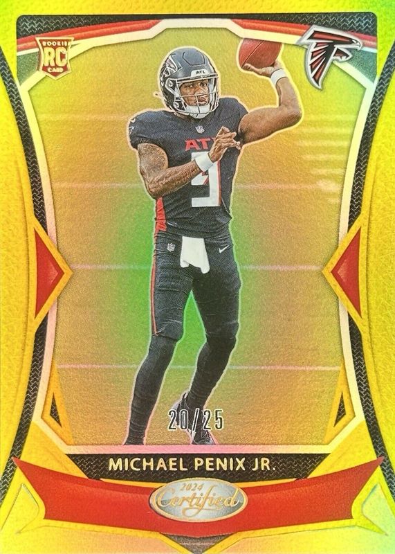 The Michael Penix Jr. 2024 Certified #106 Mirror Gold /25 Rookie card in Raw condition has not changed in price in the last 30 days and was last sold for $55.86 .