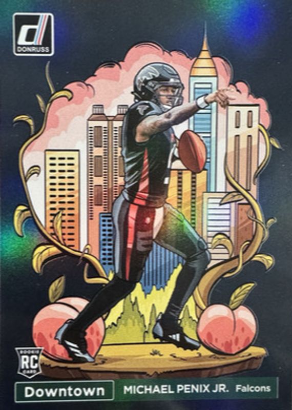 The Michael Penix Jr. 2024 Donruss #14 Downtown - Black /1 Rookie card in Raw condition has not changed in price in the last 30 days and was last sold for $15,000.00 .
