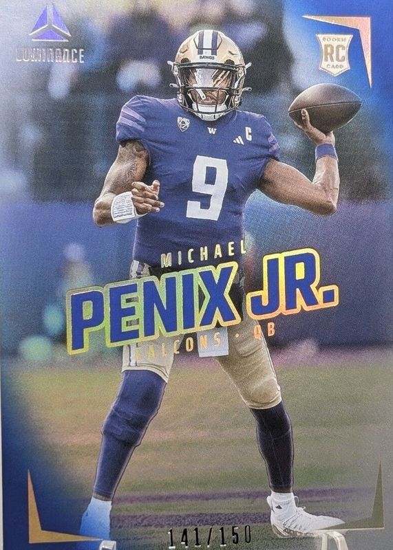 The Michael Penix Jr. 2024 Luminance #136 Vertical Rookies - Blue /150 card in Raw condition has not changed in price in the last 30 days and was last sold for $9.22 .