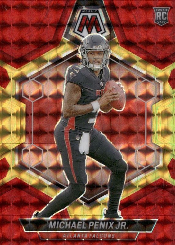 The Michael Penix Jr. 2024 Mosaic #308 Choice Fusion Red & Yellow /80 Rookie card in Raw condition has not changed in price in the last 30 days and was last sold for $122.50 .