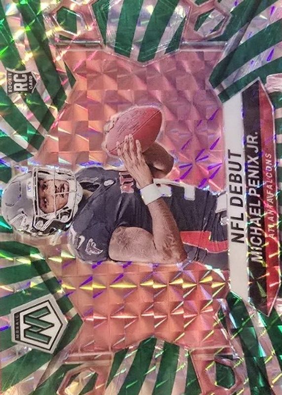 The Michael Penix Jr. 2024 Mosaic #274 NFL Debut - Green Swirl /13 Rookie card in Raw condition has not changed in price in the last 30 days and was last sold for $110.50 .