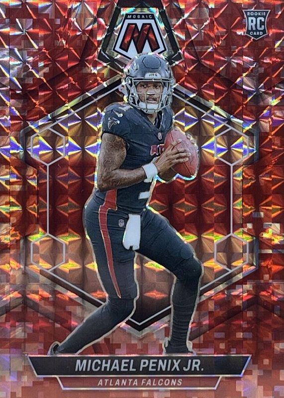 The Michael Penix Jr. 2024 Mosaic #308 Red Camo Rookie card in Raw condition has not changed in price in the last 30 days and was last sold for $15.00 .