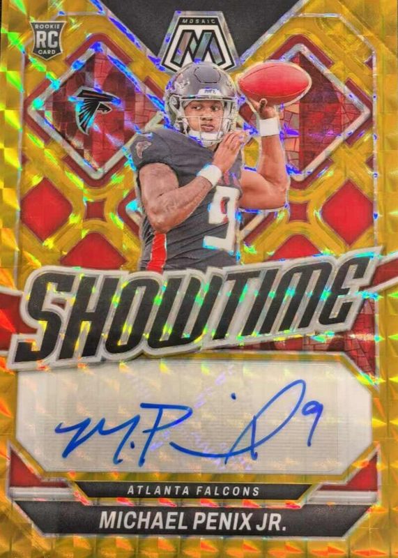 The Michael Penix Jr. 2024 Mosaic #SS-MPJ Showtime Signatures - Gold /10 Rookie card in Raw condition has not changed in price in the last 30 days and was last sold for $900.00 .