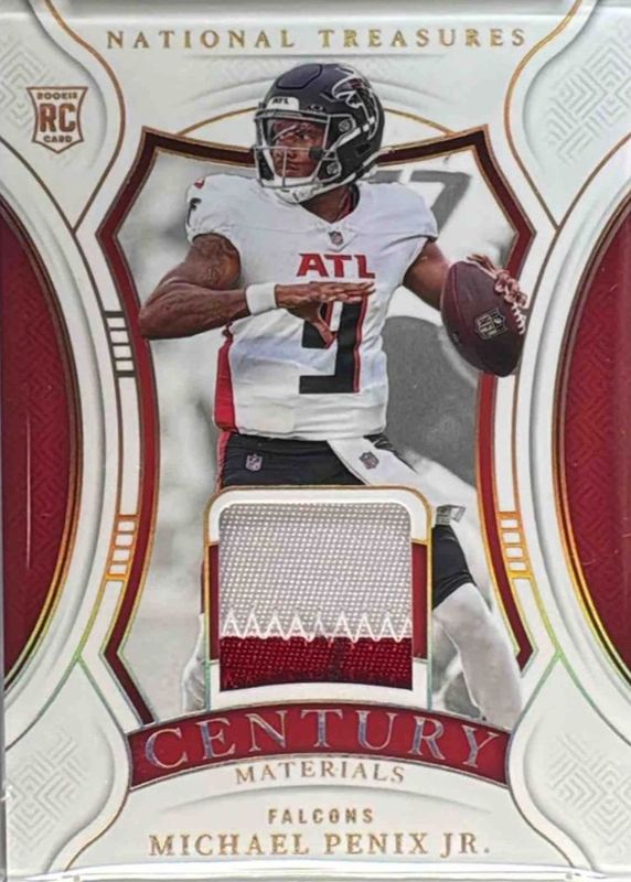 The Michael Penix Jr. 2024 National Treasures #CM-MPJ Century Materials - Holo Gold /10 Rookie card in Raw condition has not changed in price in the last 30 days and was last sold for $255.00 .