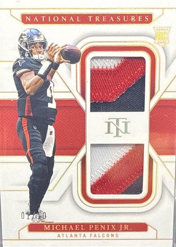 The Michael Penix Jr. 2024 National Treasures #RDM-MPJ Rookie Dual Materials - Holo Gold /10 card in Raw condition has not changed in price in the last 30 days and was last sold for $218.50 .