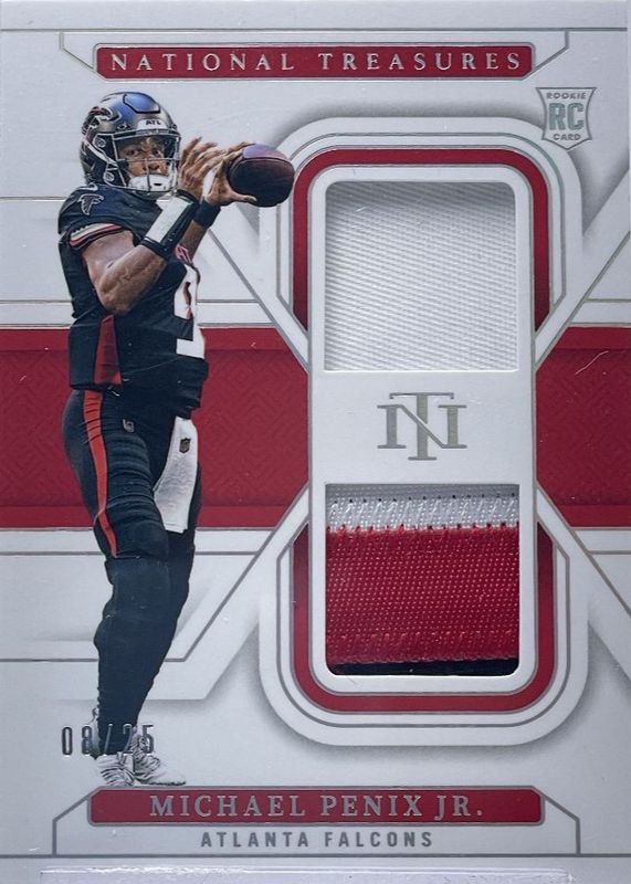 The Michael Penix Jr. 2024 National Treasures #RDM-MPJ Rookie Dual Materials - Holo Silver /25 card in Raw condition has not changed in price in the last 30 days and was last sold for $56.00 .