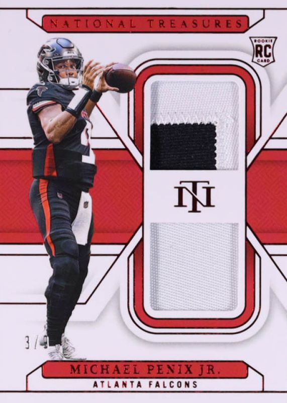 The Michael Penix Jr. 2024 National Treasures #RDM-MPJ Rookie Dual Materials - Red Jersey Number (/9) card in Raw condition has not changed in price in the last 30 days and was last sold for $65.11 .