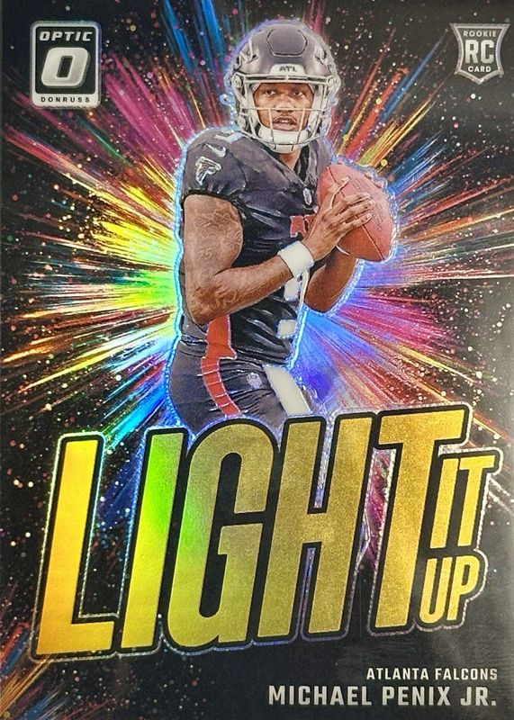 The Michael Penix Jr. 2024 Optic #3 Light It Up - Gold /10 Rookie card in Raw condition has not changed in price in the last 30 days and was last sold for $250.00 .