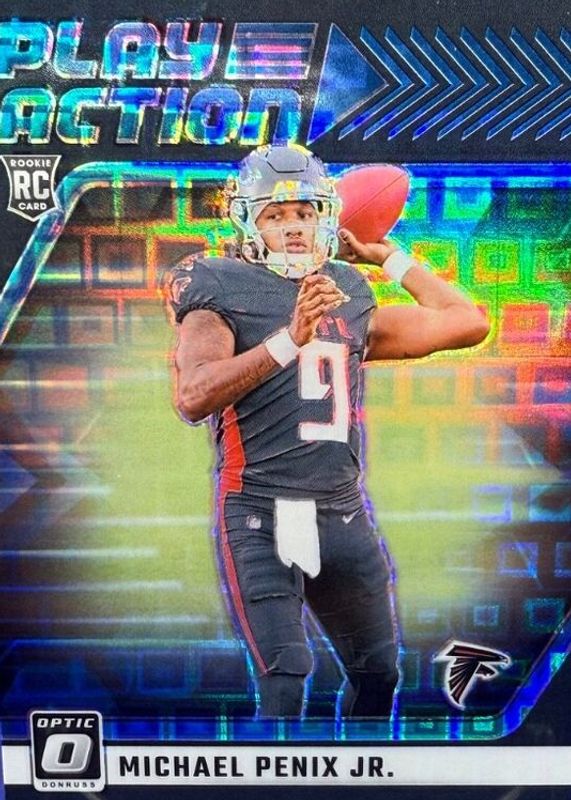 The Michael Penix Jr. 2024 Optic #4 Play Action - Black Pandora /25 Rookie card in Raw condition has not changed in price in the last 30 days and was last sold for $102.50 .