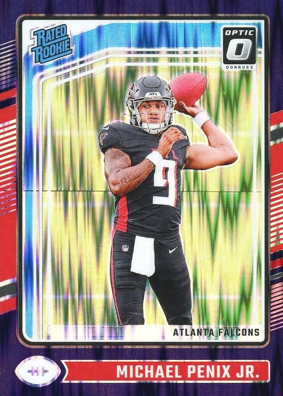 The Michael Penix Jr. 2024 Optic #279 Purple Shock Rookie card in Raw condition has moved down -$19.01 (-84.5%) in the last 30 days and was last sold for $3.50 .