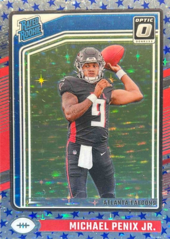 The Michael Penix Jr. 2024 Optic #279 Stars /(SSP) Rookie card in Raw condition has moved down -$0.12 (-1.7%) in the last 30 days and was last sold for $7.00 .