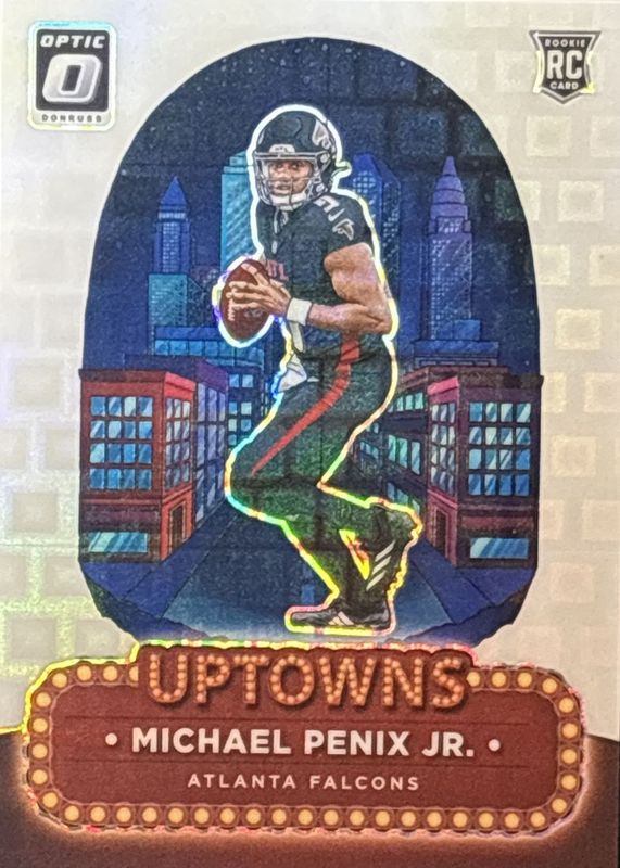 The Michael Penix Jr. 2024 Optic #9 Uptowns - Black Pandora /25 Rookie card in Raw condition has not changed in price in the last 30 days and was last sold for $1,100.00 .