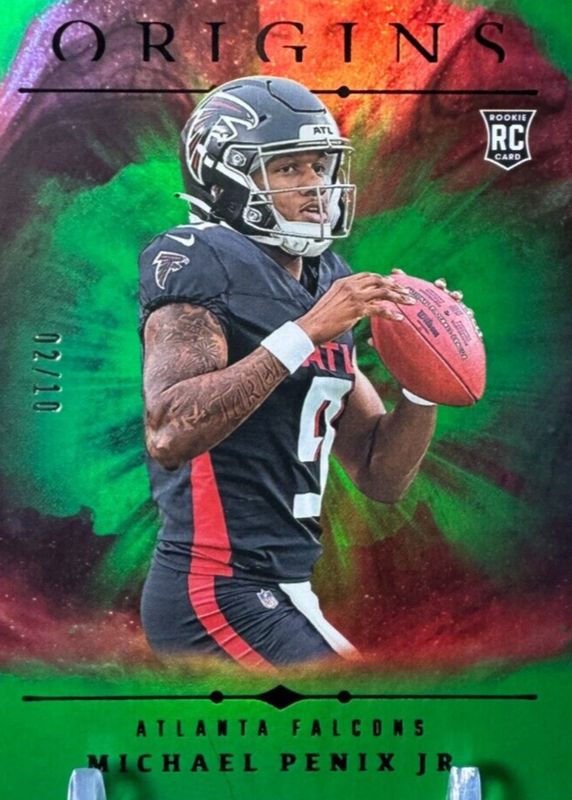The Michael Penix Jr. 2024 Origins #124 Holo Green /10 Rookie card in Raw condition has not changed in price in the last 30 days and was last sold for $103.50 .