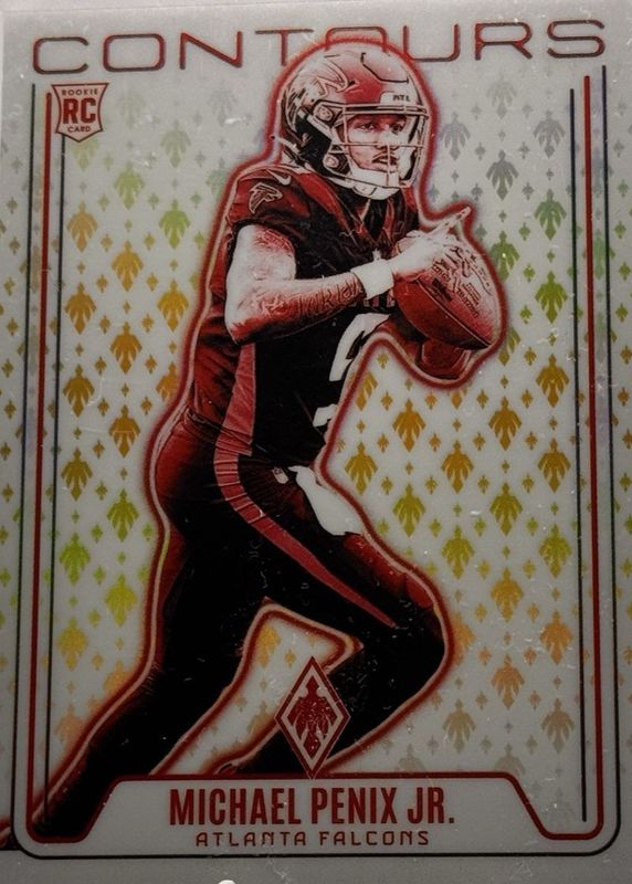 The Michael Penix Jr. 2024 Phoenix #CON-MPJ Contours - Gold /10 Rookie card in Raw condition has not changed in price in the last 30 days and was last sold for $150.00 .