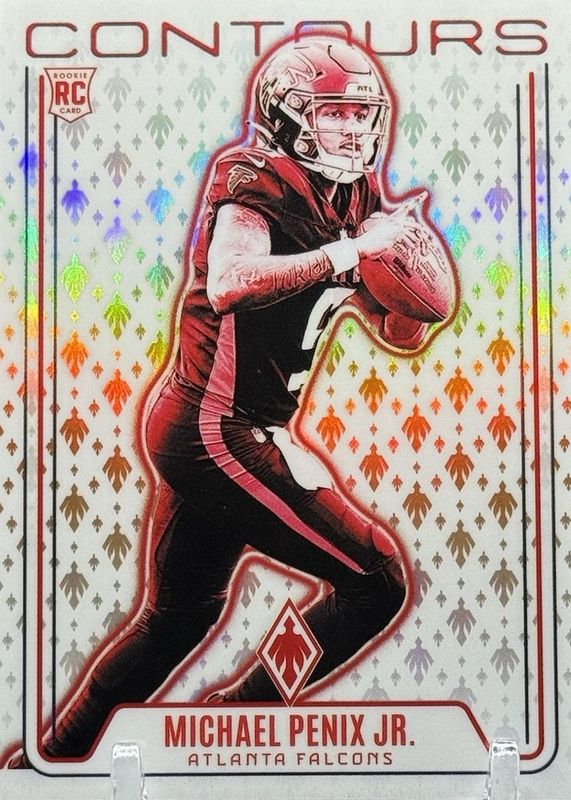 The Michael Penix Jr. 2024 Phoenix #CON-MPJ Contours - Orange Rookie card in Raw condition has not changed in price in the last 30 days and was last sold for $2.95 .