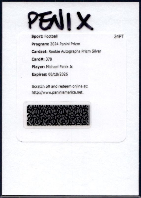 The Michael Penix Jr. 2024 Prizm #378 Base Autographs - Silver Rookie card is 1 of 174 Michael Penix Jr.'s card variations in the 2024 Prizm set being tracked by Sports Card Investor, including Base, Choice Blue Yellow Green, Choice Silver, Disco, and Green.