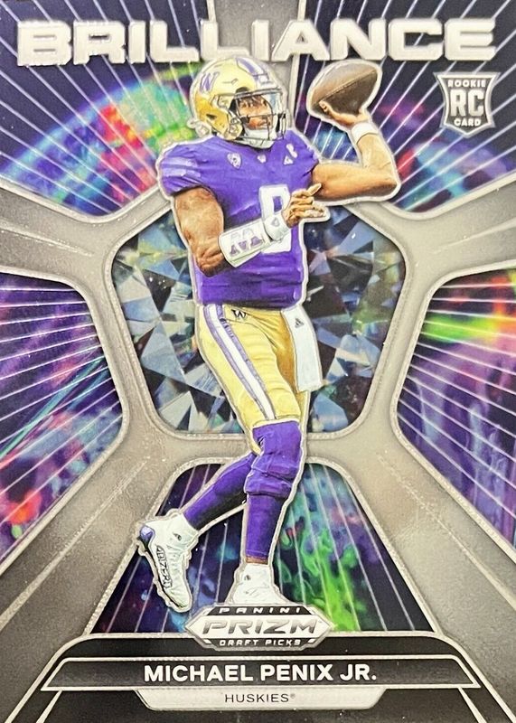 The Michael Penix Jr. 2024 Prizm Draft Picks #BR-MPJ Brilliance Rookie card in Raw condition has not changed in price in the last 30 days and was last sold for $1.95 .