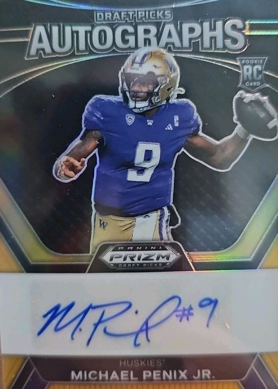 The Michael Penix Jr. 2024 Prizm Draft Picks #DPA-MPJ Draft Picks Autographs - Black & Gold /5 Rookie card in Raw condition has not changed in price in the last 30 days and was last sold for $255.00 .