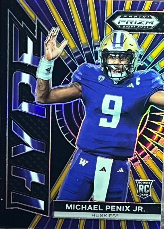 The Michael Penix Jr. 2024 Prizm Draft Picks #HP-MPJ Hype - Black Gold /5 Rookie card is 1 of 199 Michael Penix Jr.'s card variations in the 2024 Prizm Draft Picks set being tracked by Sports Card Investor, including Base, Green, Purple Wave, Red Ice, and Ruby Wave.