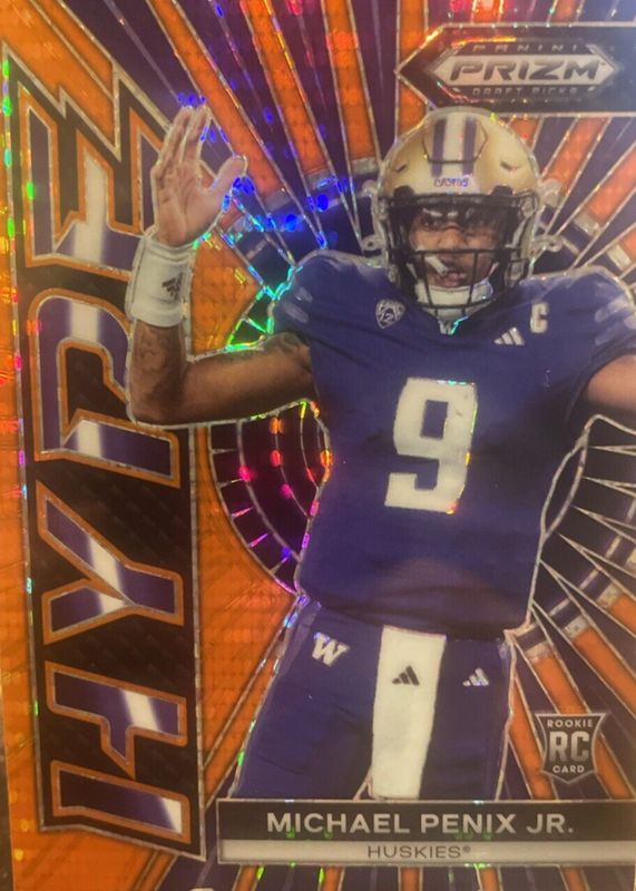 The Michael Penix Jr. 2024 Prizm Draft Picks #HP-MPJ Hype - Orange Pulsar /49 Rookie card in Raw condition has not changed in price in the last 30 days and was last sold for $19.99 .