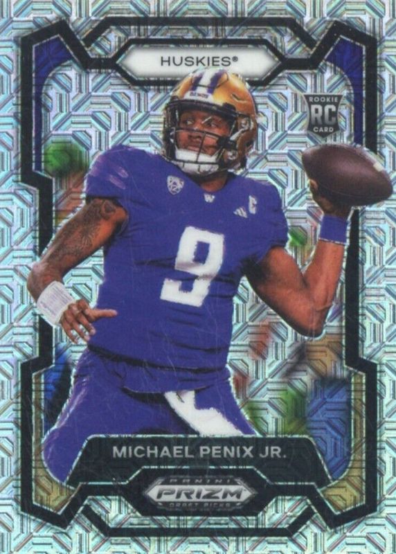 The Michael Penix Jr. 2024 Prizm Draft Picks #101 Mojo /25 Rookie card in Raw condition has not changed in price in the last 30 days and was last sold for $43.86 .