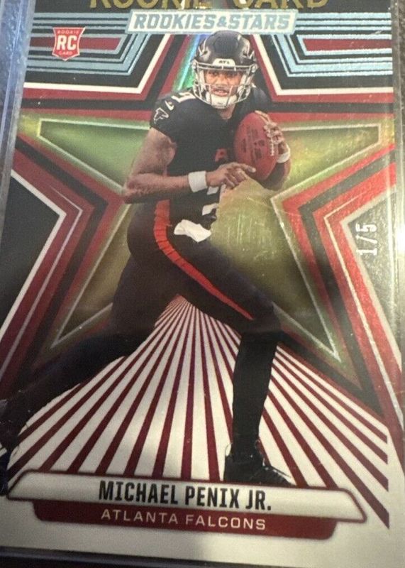 The Michael Penix Jr. 2024 Rookies & Stars #179 Black & Blue /5 card in Raw condition has not changed in price in the last 30 days and was last sold for $57.00 .