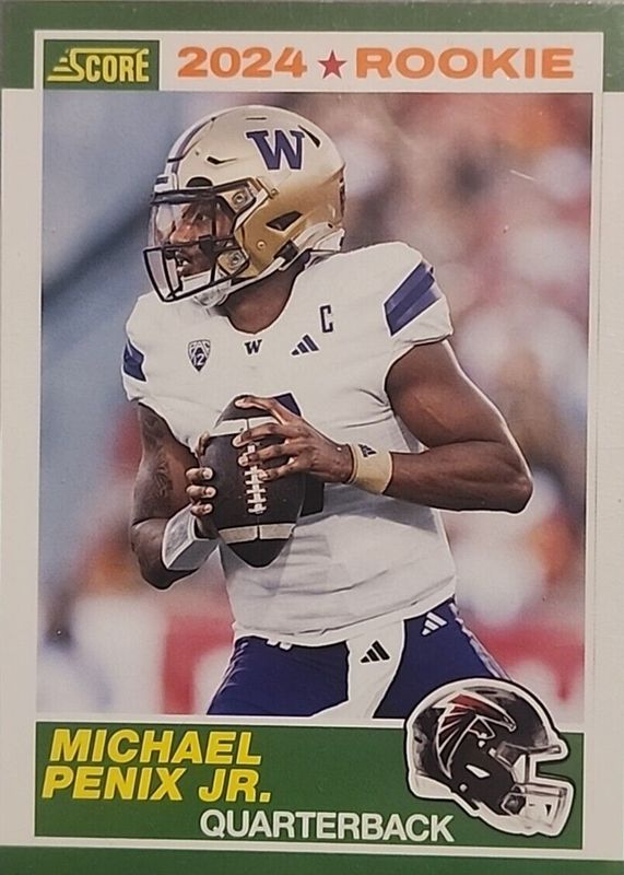The Michael Penix Jr. 2024 Score #7 35th Anniversary Rookie - Orange card in Raw condition has not changed in price in the last 30 days and was last sold for $3.30 .