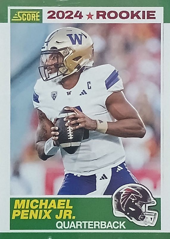 The Michael Penix Jr. 2024 Score #7 35th Anniversary Rookie - Red card in Raw condition has not changed in price in the last 30 days and was last sold for $1.75 .