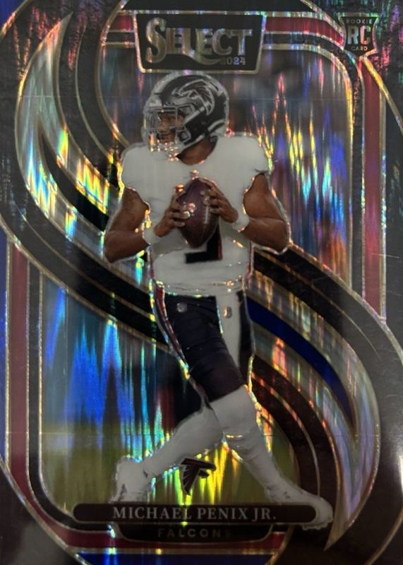 The Michael Penix Jr. 2024 Select #110 Premier Level Black & Blue Shock Rookie card in Raw condition has moved down -$1.00 (-50.3%) in the last 30 days and was last sold for $0.99 .