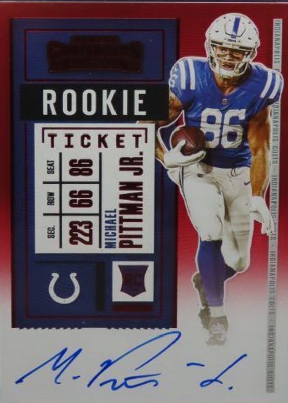 The Michael Pittman Jr. 2020 Contenders #114 Rookie Ticket Auto - Red Zone Ticket card in Raw condition has not changed in price in the last 30 days and was last sold for $89.00 .