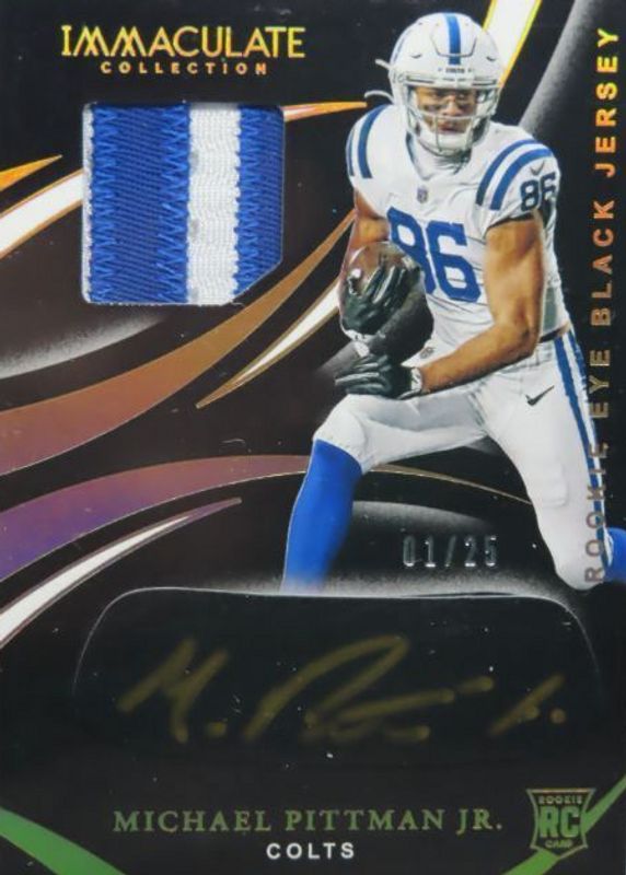 The Michael Pittman Jr. 2020 Immaculate #REB-19 Immaculate Rookie Eye Black Jersey Autographs - Gold /25 card in Raw condition has not changed in price in the last 30 days and was last sold for $53.33 .
