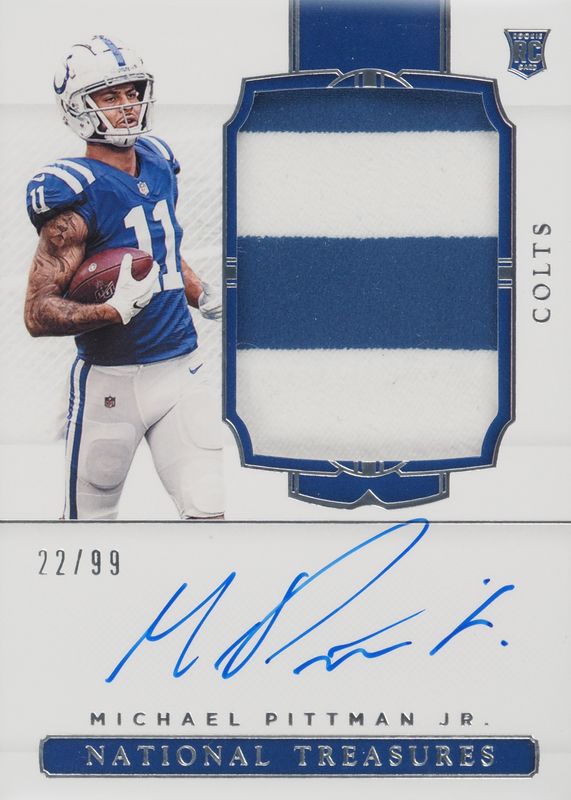 This card is 1 of 35 Michael Pittman Jr.'s card variations in the 2020 National Treasures set being tracked by Sports Card Investor, including Rookie Patch Auto - Green Jersey Number (/11), Rookie Patch Auto - Holo Silver /25, Rookie Patch Auto - Midnight /20, Rookie Patch Auto - Stars & Stripes /20, and Rookie Patch Auto - Holo Gold /10.