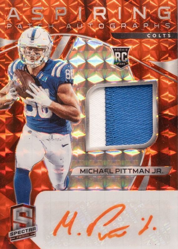 The Michael Pittman Jr. 2020 Spectra #218 Rookie Patch Auto - Neon Orange /15 card in Raw condition has not changed in price in the last 30 days and was last sold for $75.50 .