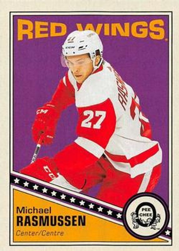The Michael Rasmussen 2019 O-Pee-Chee #239 Retro card is 1 of 8 Michael Rasmussen's card variations in the 2019 O-Pee-Chee set being tracked by Sports Card Investor, including Base, Blue Border, Gold Border, Red Border, and Red Border Blank Back.