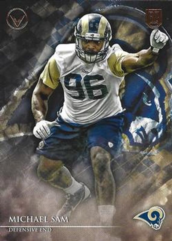 The Michael Sam 2014 Topps Valor #96 Retail Rookie card is 1 of 39 Michael Sam's card variations in the 2014 Topps Valor set being tracked by Sports Card Investor, including Base, Speed, Strength /499, Courage /399, and Discipline /299.