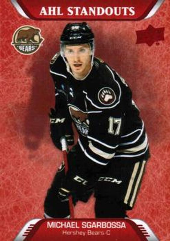 The Michael Sgarbossa 2020 Upper Deck AHL #229 Red card is 1 of 13 Michael Sgarbossa's card variations in the 2020 Upper Deck AHL set being tracked by Sports Card Investor, including #229 Base, #24 Base, #24 UD Exclusives /100, #229 Gold /25, and #24 UD High Gloss /10.