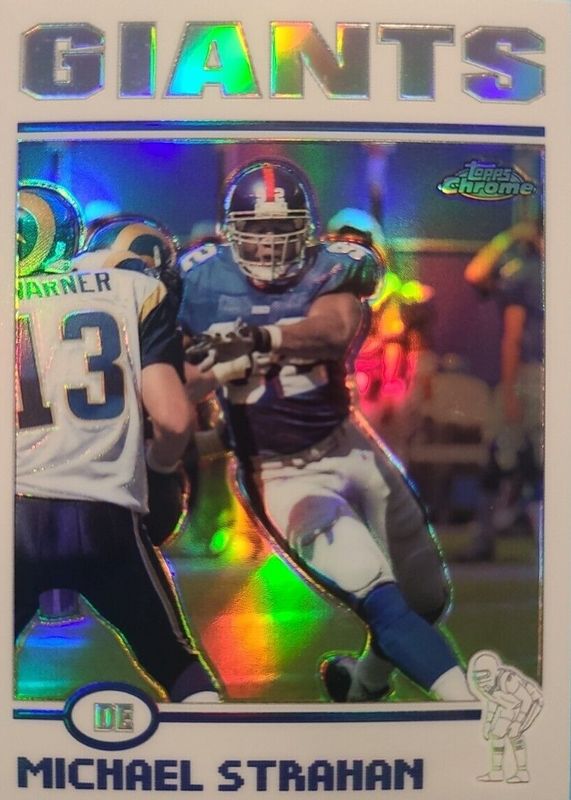This card is 1 of 2 Michael Strahan's card variations in the 2004 Topps Chrome set being tracked by Sports Card Investor, including Black Refractor /100.