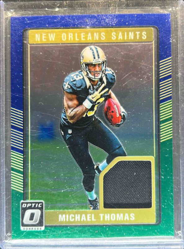 The Michael Thomas 2016 Optic #DRT-MT Rookie Threads - Blue & Green card is 1 of 40 Michael Thomas' card variations in the 2016 Optic set being tracked by Sports Card Investor, including #186 Base, Base, #186 Bronze, #186 Holo, and Holo.