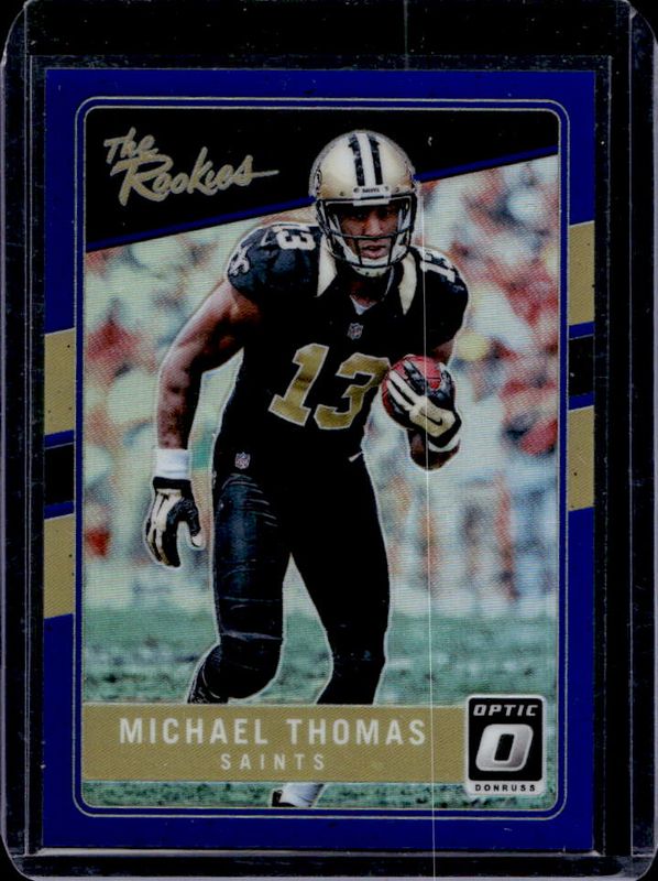 The Michael Thomas 2016 Optic #TR-MT The Rookies - Blue /149 card is 1 of 40 Michael Thomas' card variations in the 2016 Optic set being tracked by Sports Card Investor, including #186 Base, Base, #186 Bronze, #186 Holo, and Holo.