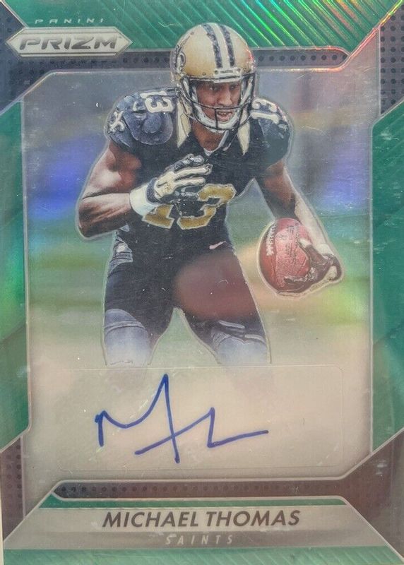 The Michael Thomas 2016 Prizm #RA-MTH Rookie Autographs - Green card in Raw condition has not changed in price in the last 30 days and was last sold for $55.00 .
