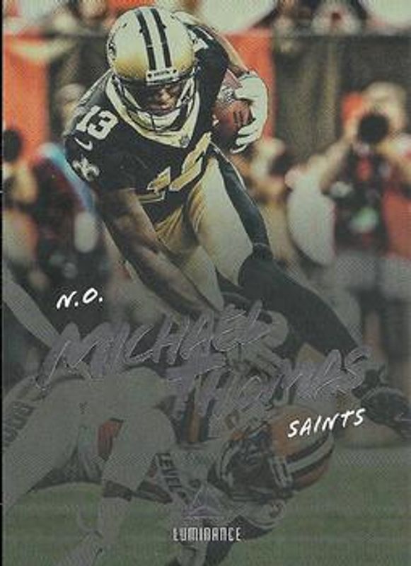 The Michael Thomas 2018 Luminance #83 Base card is 1 of 16 Michael Thomas' card variations in the 2018 Luminance set being tracked by Sports Card Investor, including Gold, Orange /225, Blue /99, Platinum Blue /25, and Red /10.