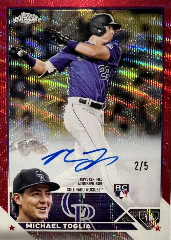 Auctions Ending Soon for Michael Toglia 2023 Topps Chrome #RA-MT Rookie Autographs - Red Wave Refractor /5 RAW