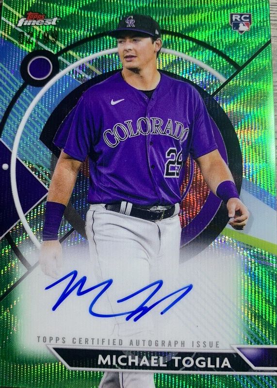 This card is 1 of 11 Michael Toglia's card variations in the 2023 Topps Finest set being tracked by Sports Card Investor, including Finest Autographs, Finest Autographs - Blue Refractor /150, Finest Autographs - Green Wave Refractor /99, Finest Autographs - Gold Refractor /50, and Finest Autographs - Gold Wave Refractor /50.