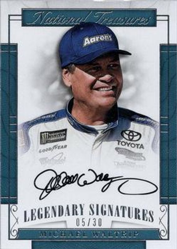 The Michael Waltrip 2017 National Treasures NASCAR #LS-MW Legendary Signatures /75 card is 1 of 38 Michael Waltrip's card variations in the 2017 National Treasures NASCAR set being tracked by Sports Card Investor, including Base /25, Century Holo Silver /20, Century Gold /15, Century Holo Gold /10, and Century Green /5.