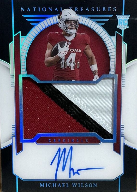 This card is 1 of 36 Michael Wilson's card variations in the 2023 National Treasures set being tracked by Sports Card Investor, including Rookie Material Signatures - Green Jersey Number (/14), Rookie Patch Auto - Green Jersey Number (/14), Crossover Rookie Patch Autographs /99, Rookie Material Signatures /99, and Rookie Patch Auto /99.